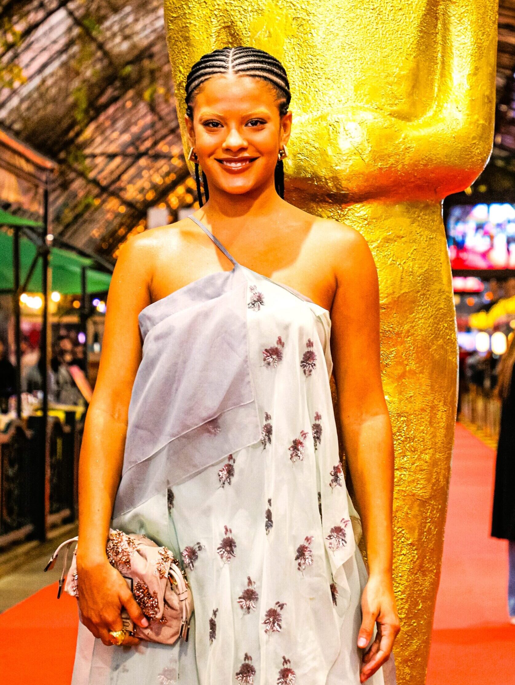 Um festival de cinema, em principal se tratando do de Gramado, sempre tem que ter estrelas. Bella Campos com certeza é a dessa edição, mas não só de agora já que dá para ver que ela veio para fincar seu nome na dramaturgia. Na exibição do seu filme de estreia no cinema “Cinco Tipos de Medo“, dirigido por Bruno Bini, que é seu conterrâneo cuiabano, Bella – deslumbrante em um modelo da grife italiana Fendi – foi o furor do tapete vermelho desde que esse ficou azul por uma noite, a da abertura, em homenagem à Rodrigo Santoro e o filme que estava “O Ultimo Azul” de Gabriel Mascaro. Mas agora o assunto é Bella, que mostrou que quem estava ali era uma atriz por um filme em competição, mas sem deixar de reconhecer que o motivo de tamanho “frisson” era a Maria de Fátima que interpreta na novela “Vale Tudo”. “A Fátima estaria amando estar aqui, nesse ambiente, tirando várias fotos, arrumando alguma coisa para se aparecer, porque é isso que ela fica fazendo toda hora“, brincou Bella sobre a vilã que interpreta. É claro que o público que cercava a Rua Coberta a chamava pelo personagem televisivo (entenda-se que muitos nunca entraram no cinema ).